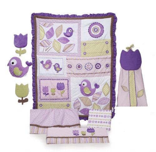 Your baby will rest peacefully amidst softly colored purple, green and taupe leaves, tulips and sweetly chirping birds. The Tweet 8 piece crib bedding set includes a quilt, dust ruffle, fitted sheet, diaper stacker, valance and a 3 piece fabric wall art. The quilt features an array of appliques including faux suede, velour and fleece. Quilt measures 36" x 45". The dust ruffle has a 14" drop, is made of purple allover print with a 3" tall striped border and fits a standard size crib. Allover print fitted crib sheet is 100% cotton and measures 28" W x 52" L. The diaper stacker pleasingly accompanies this set with a soft fabric tulip flap. It measures 32" x 16.5", and is 4" deep and provides decorative hanging or setting storage for your child's diapers. The window valance is 60" x 14". Complementing the set is a three piece fabric wall art that includes two colorful tulips and one sweet bird each measures 9" X 9". Care instructions: machine wash cold with like colors in gentle cycle, do not bleach, tumble dry low and iron on lowest setting as needed.